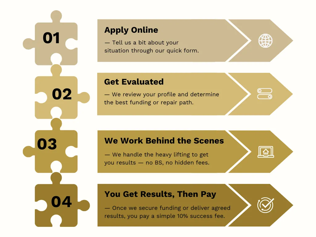 We help qualified individuals and business owners secure funding — with zero upfront fees.